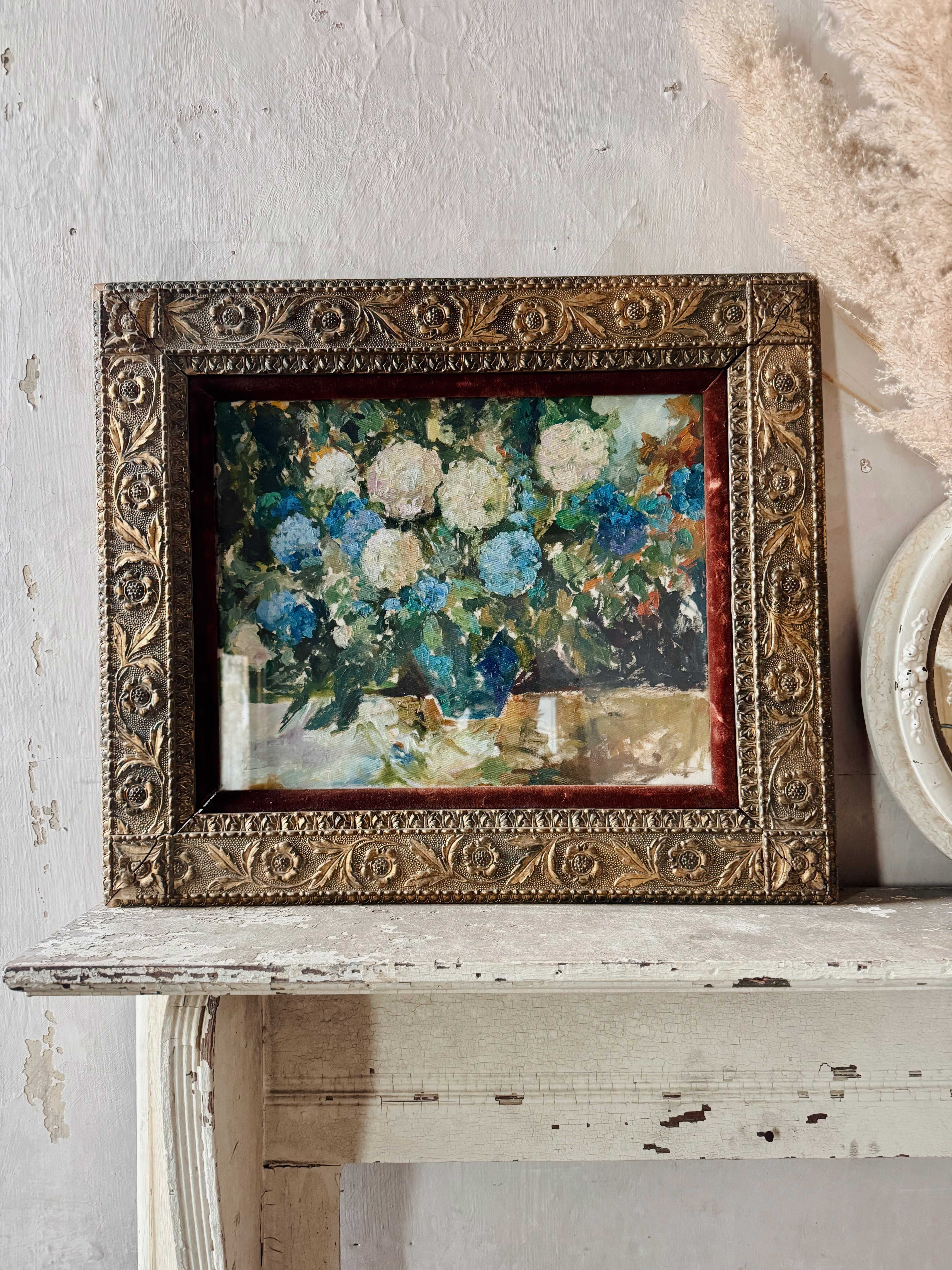 Hand-painted cotton canvas in antique frame.