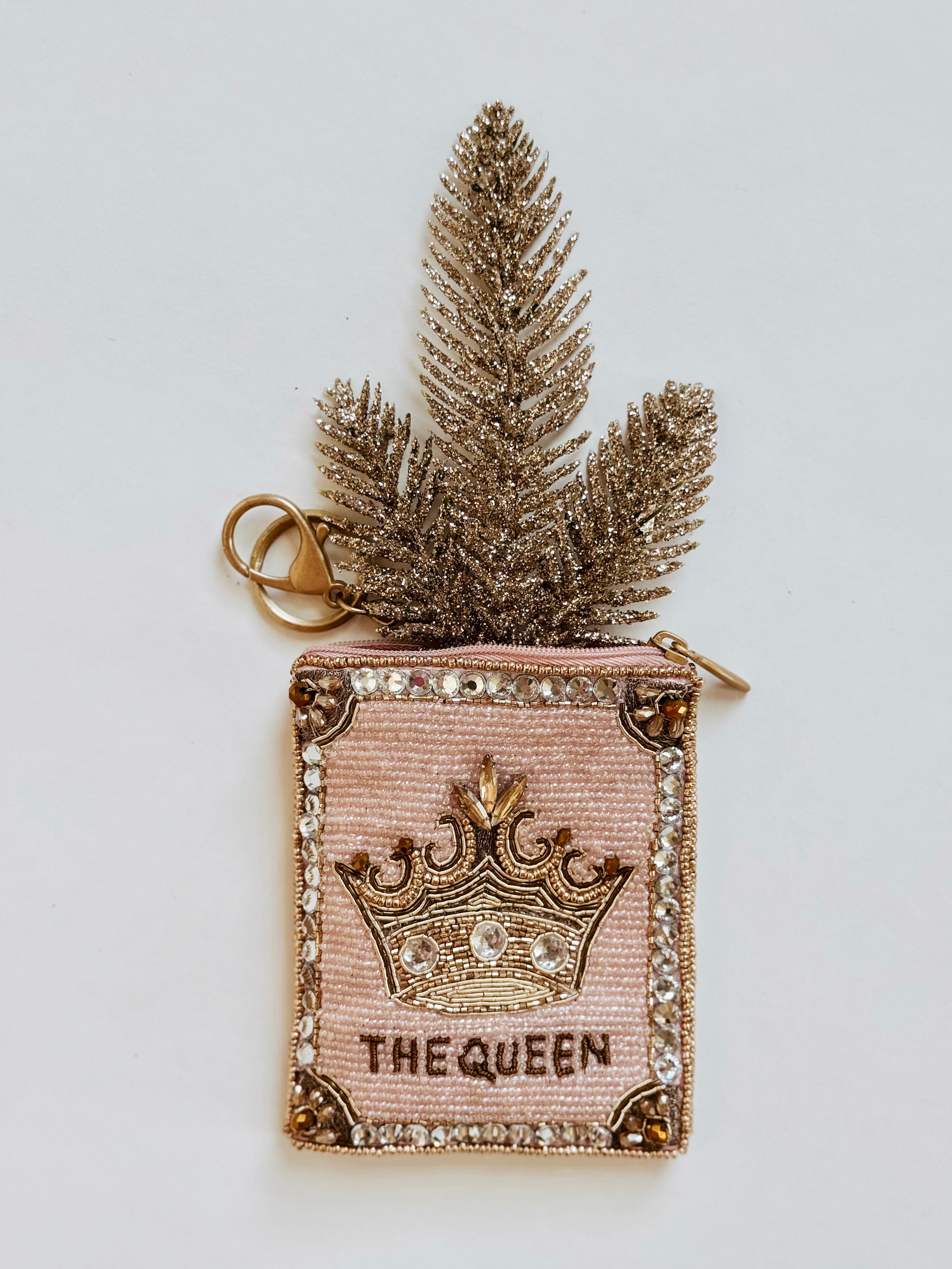 Gift a little fashion with this beaded coin purse featuring a glittering gold crown on a soft pink beaded background. Attach to any handbag.