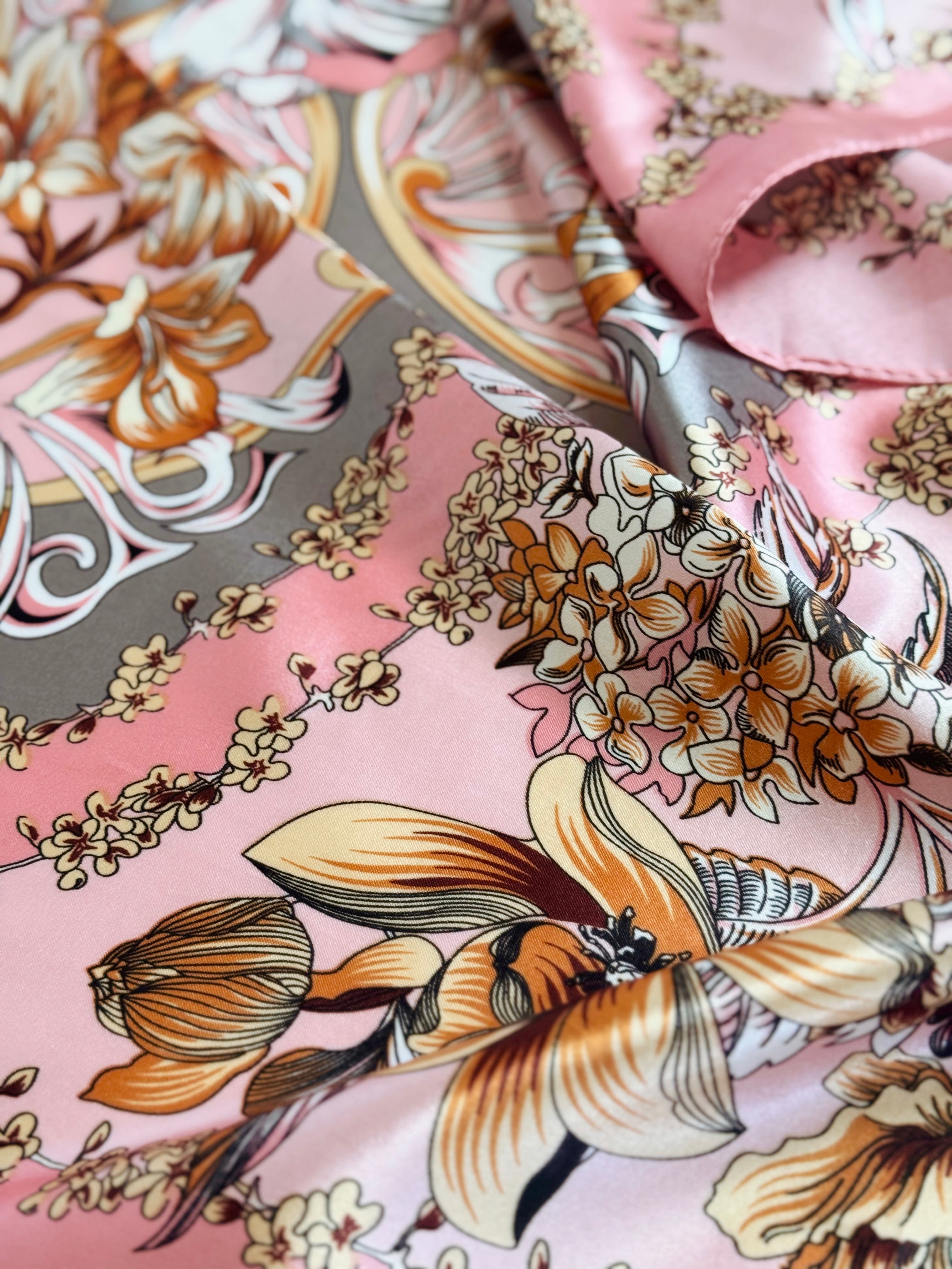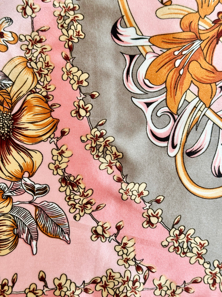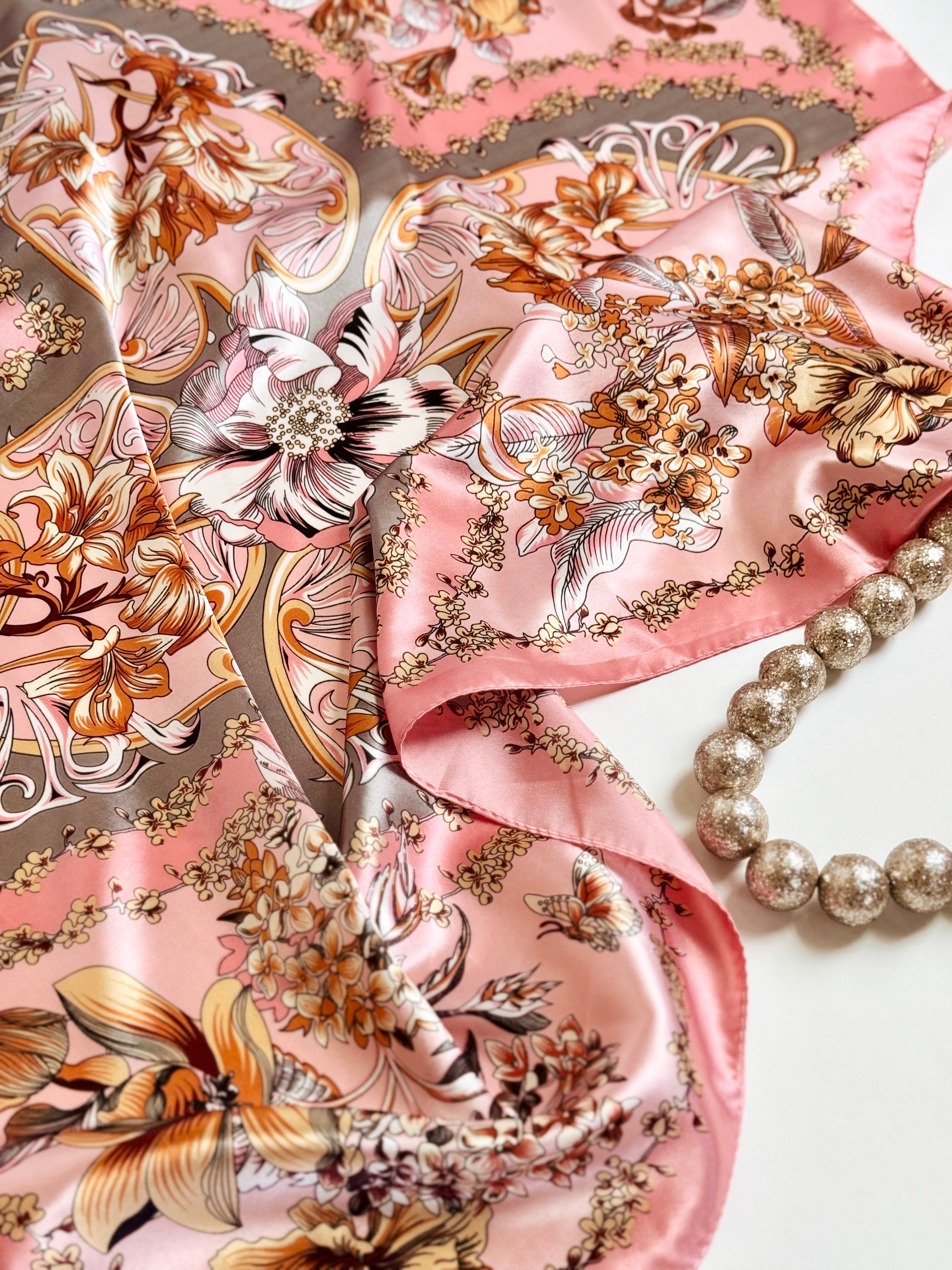 Elevate your style with this silky square scarf adorned with a beautiful floral motif. Tie around your purse, wear in your hair - oh, the endless possibilities!!