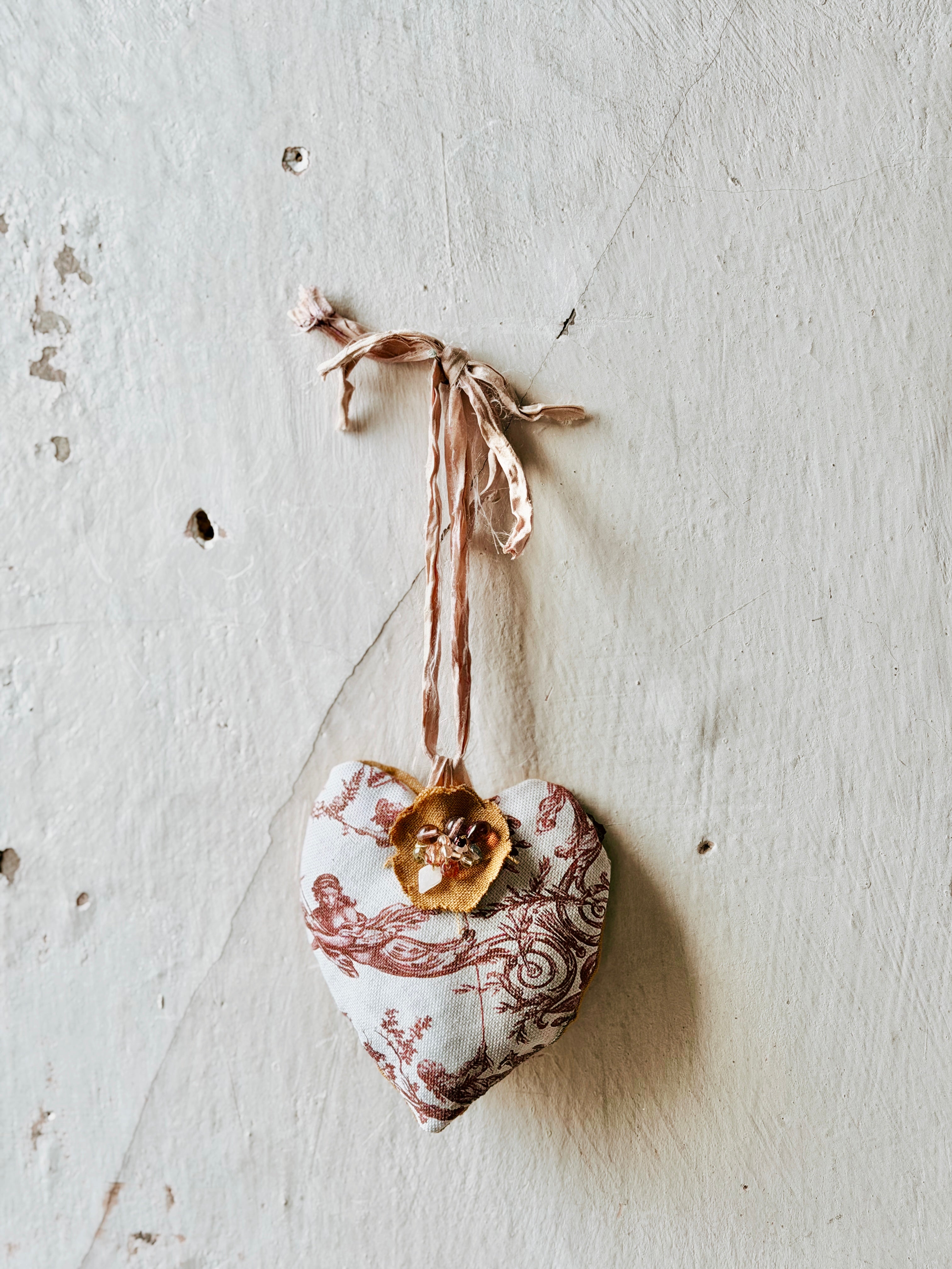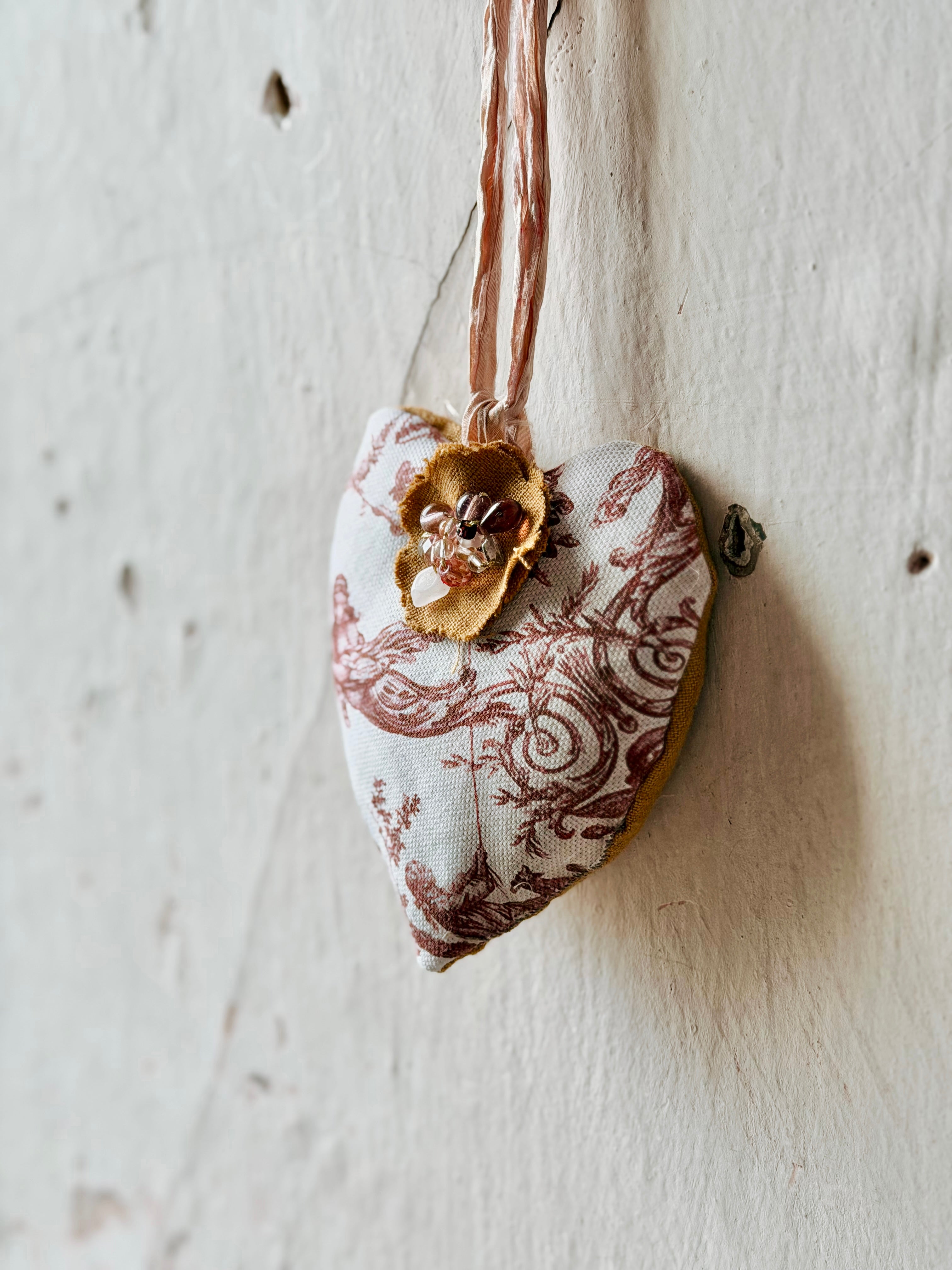 Handmade in our Patina Vie studios, these French-Style Handmade heart sachets are filled with our fragrant French White scent. ( notes of linen, musk, vanilla)