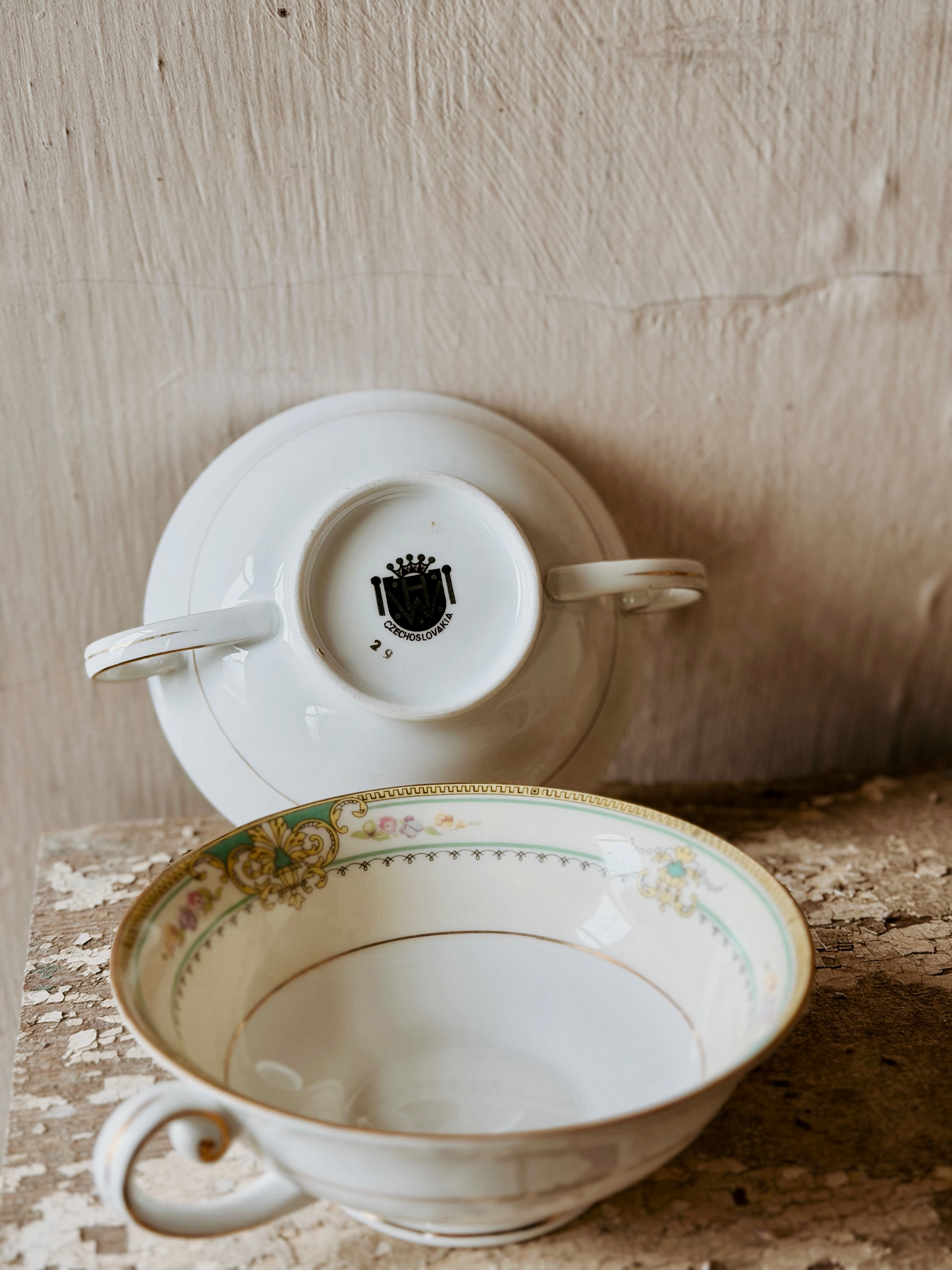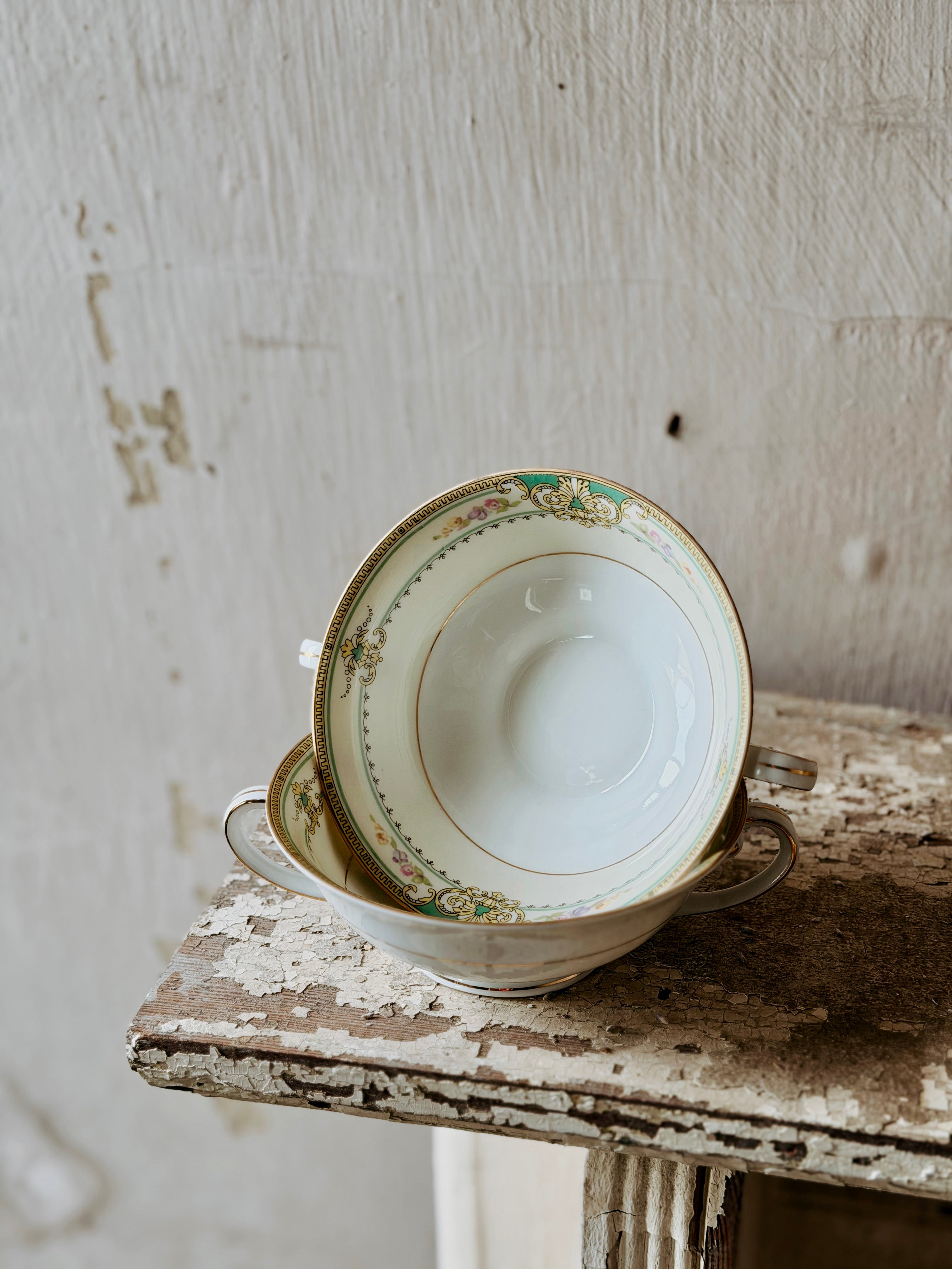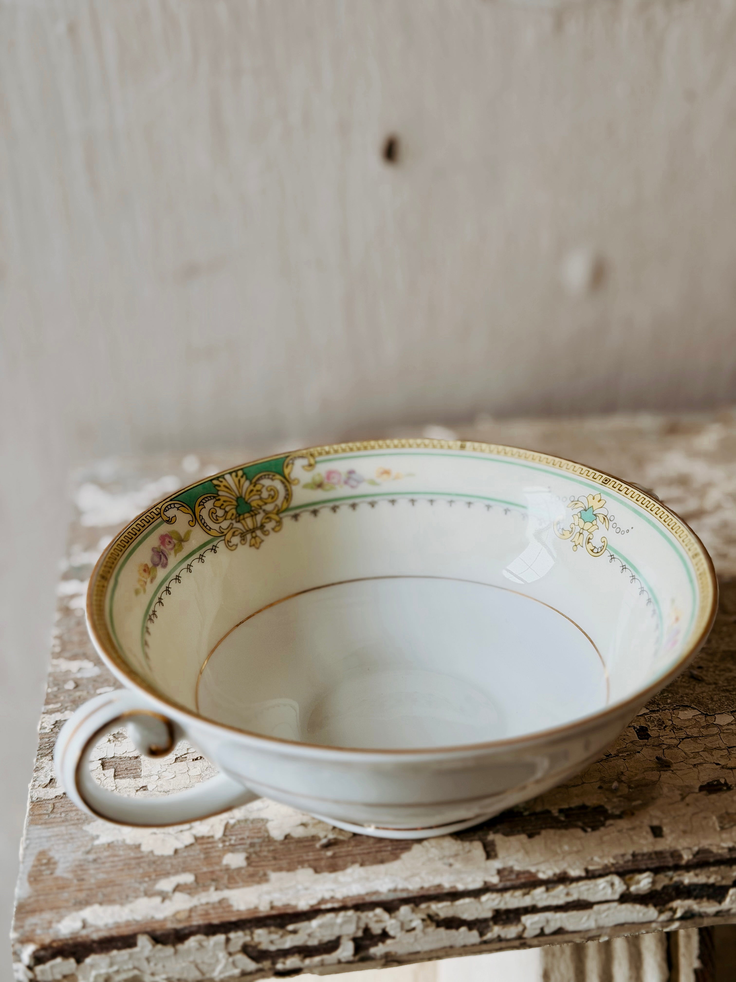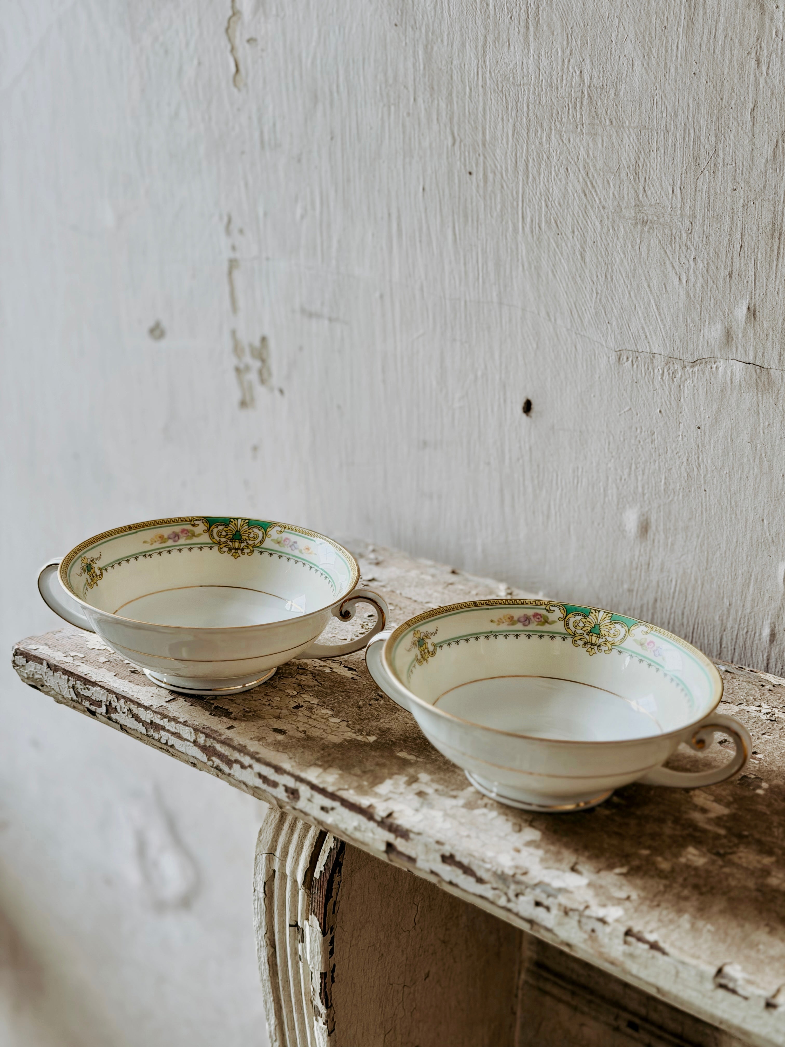Hand painted design with a gold rim... these Czechoslovakia soup bowls would be a great addition to your kitchen + collection!
