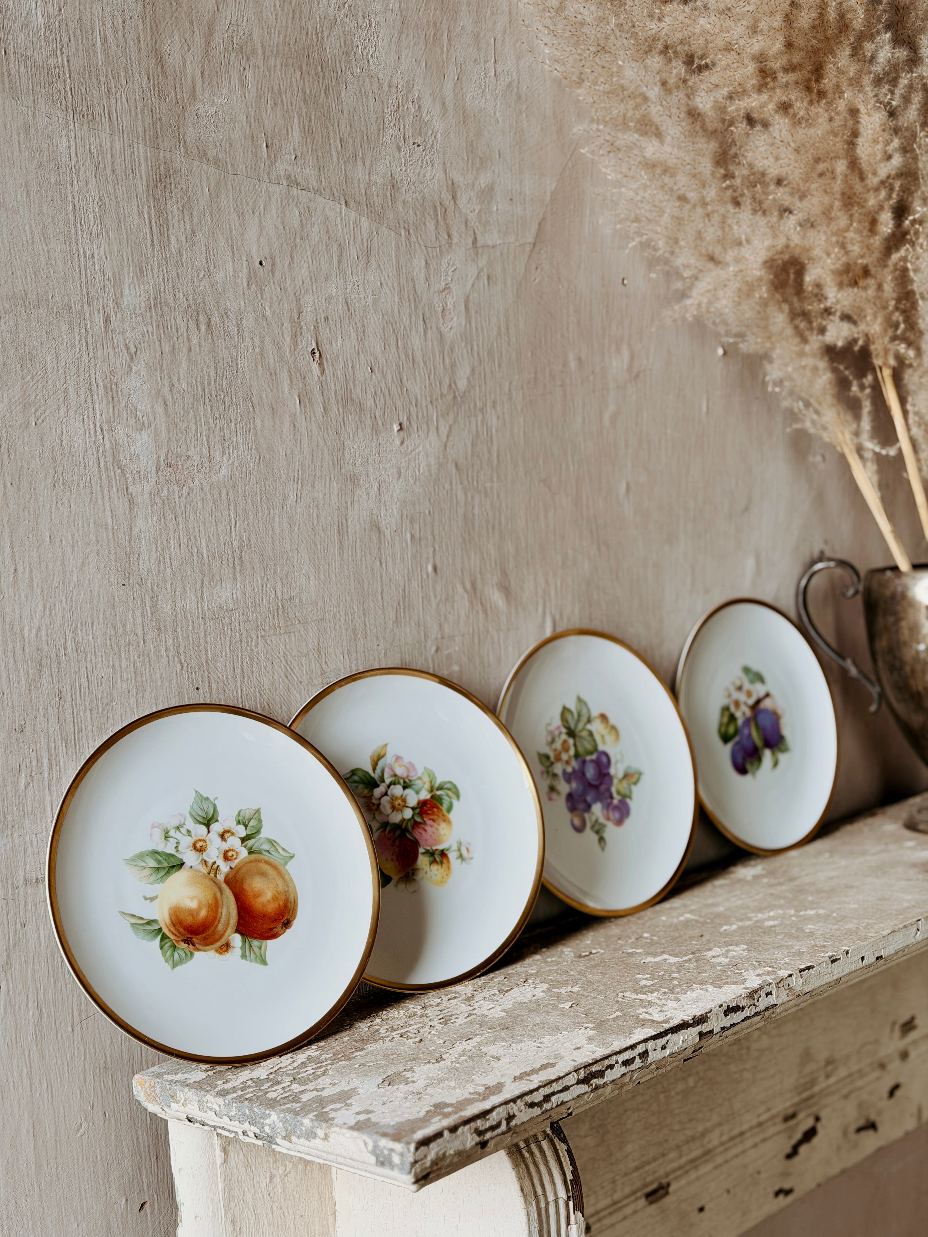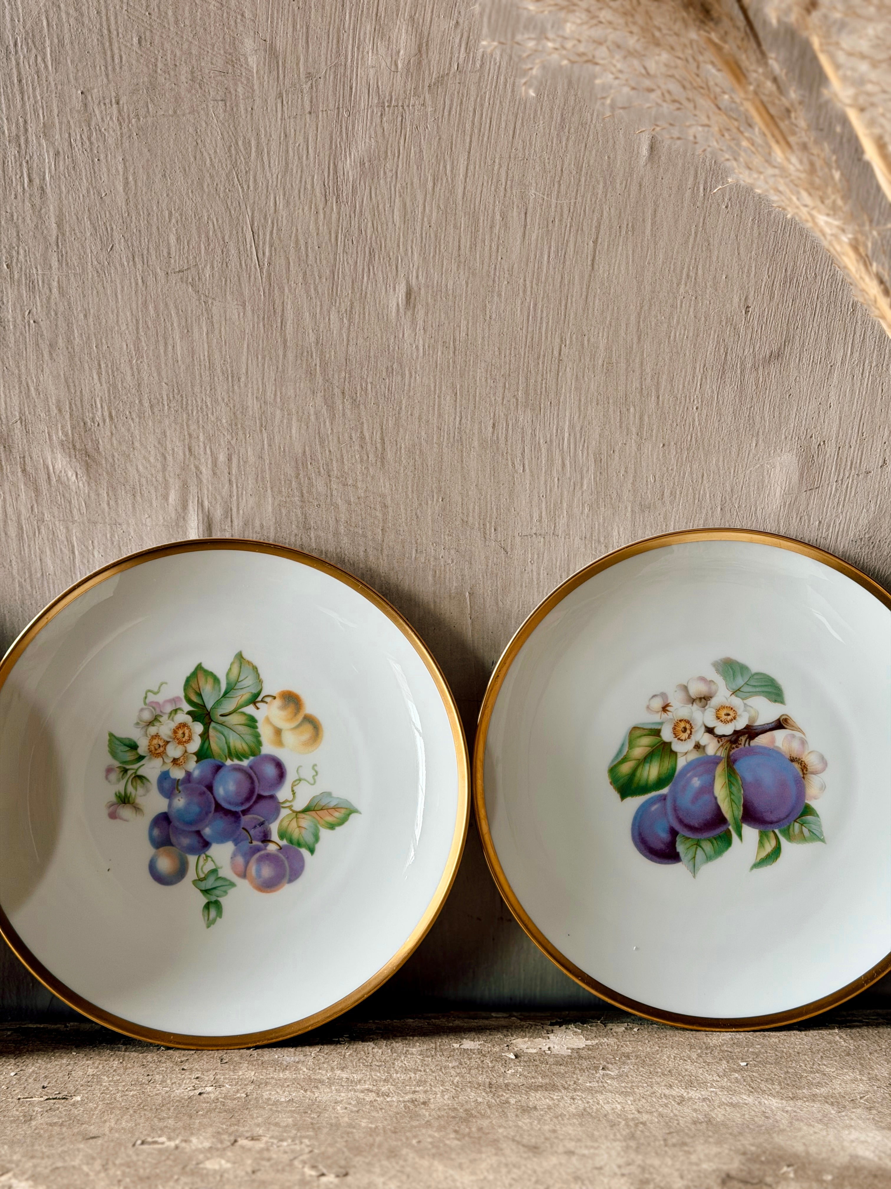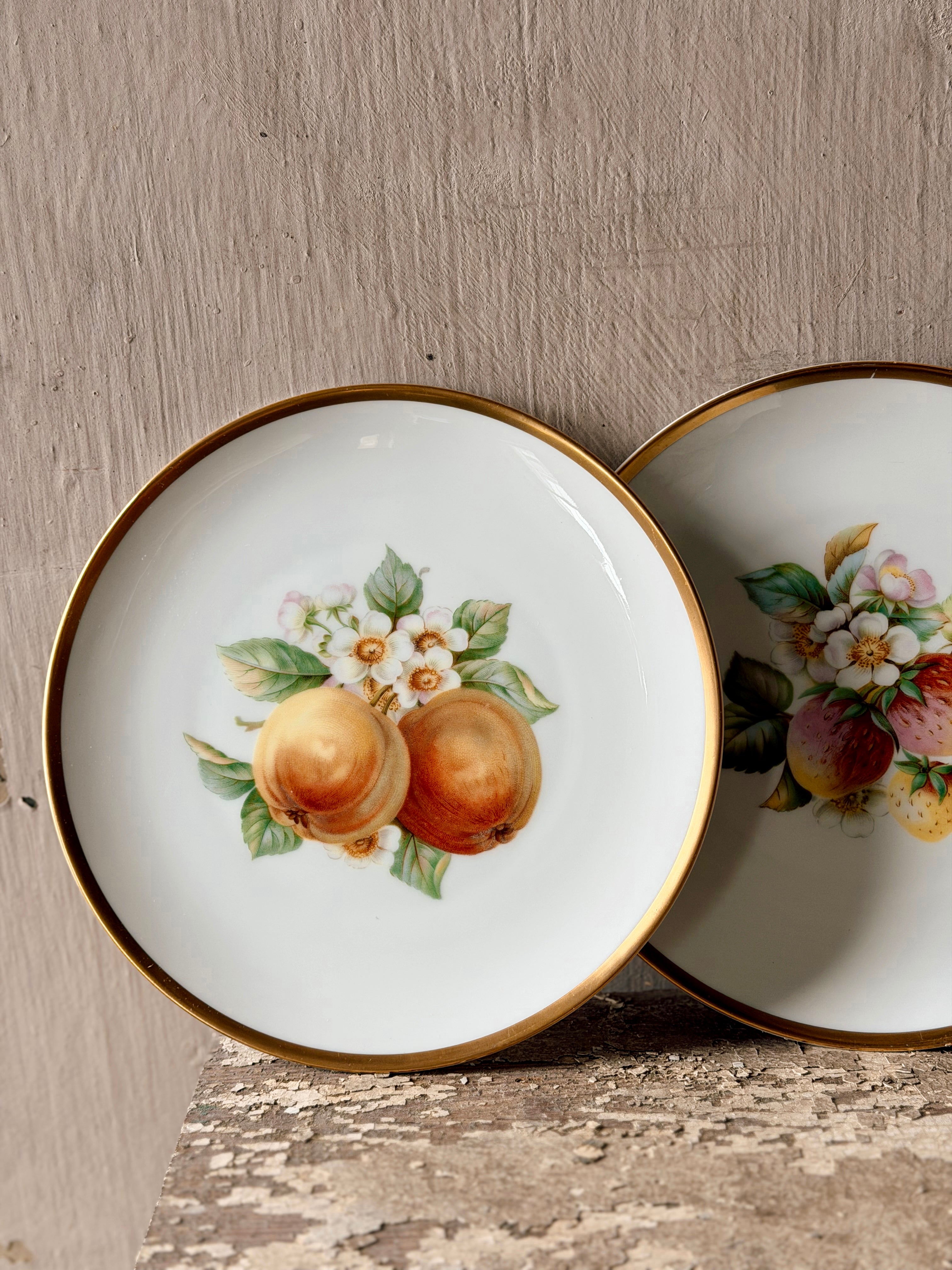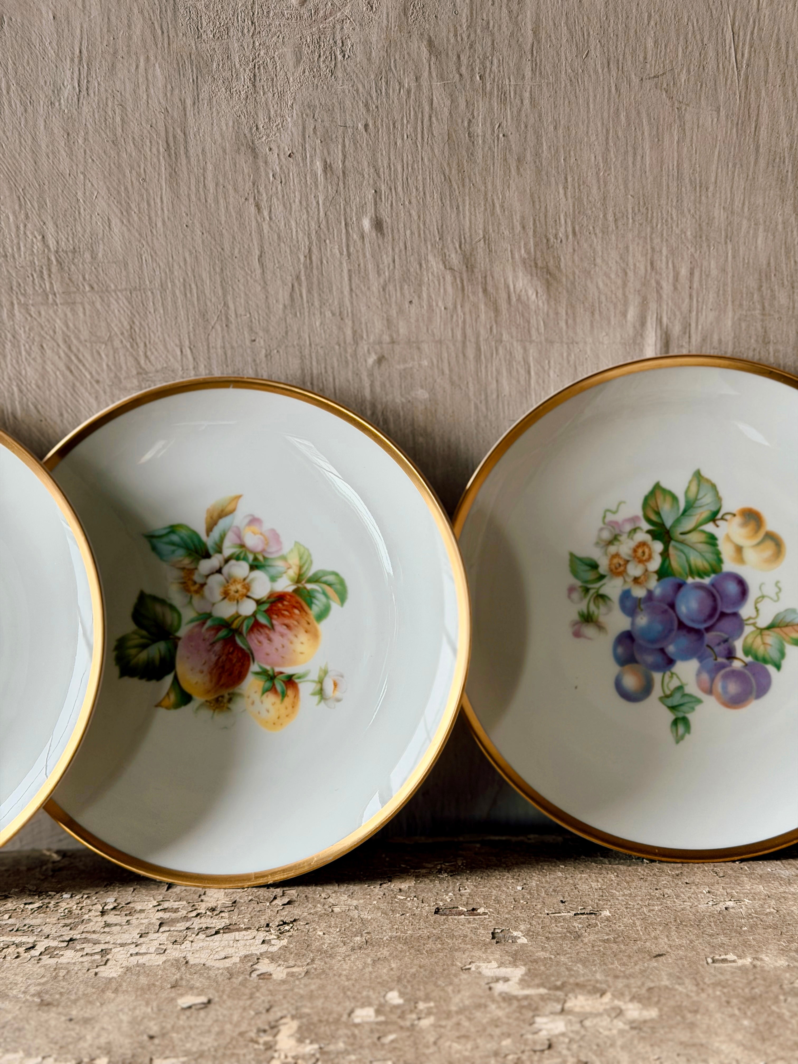A charming set of gold rimmed fruit plates that would look gorgeous in your kitchen or on your plate wall.