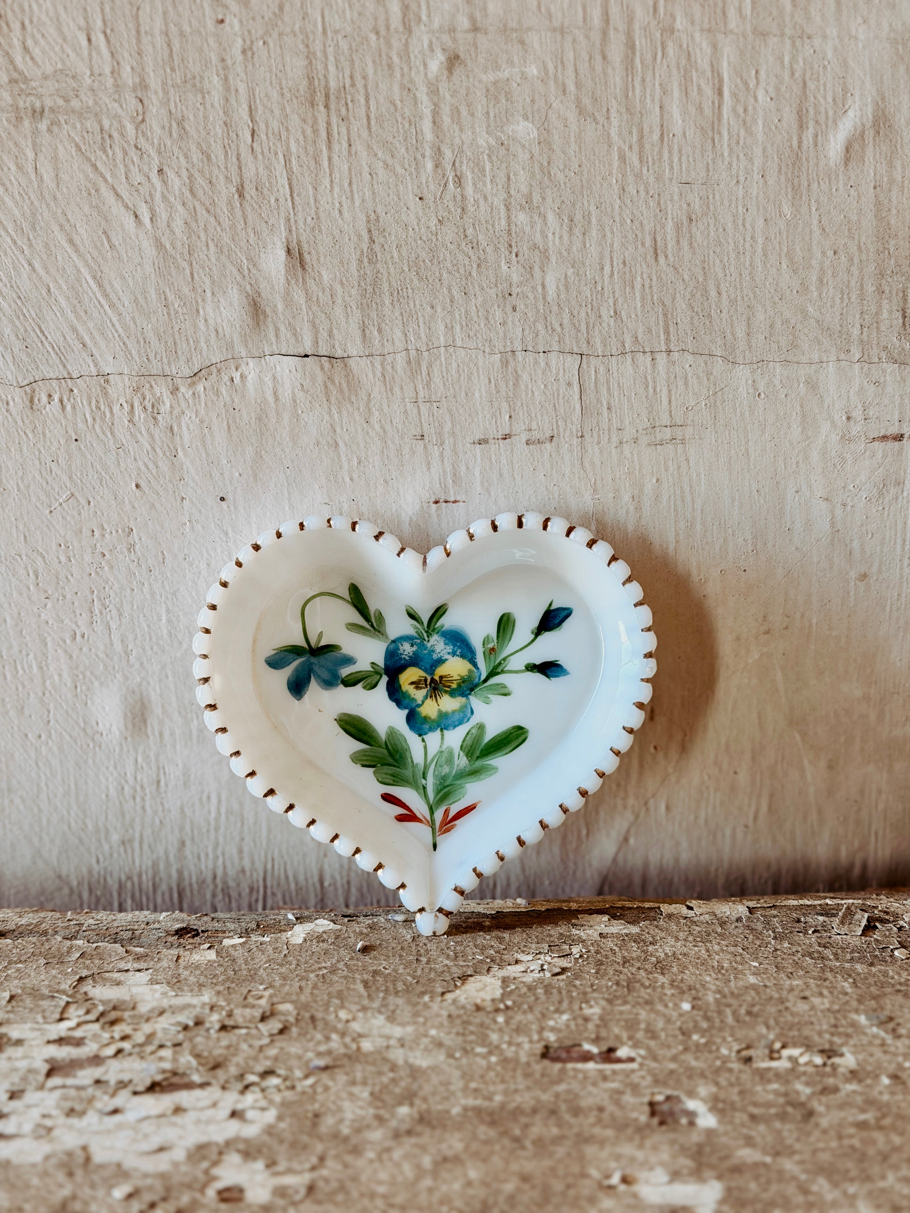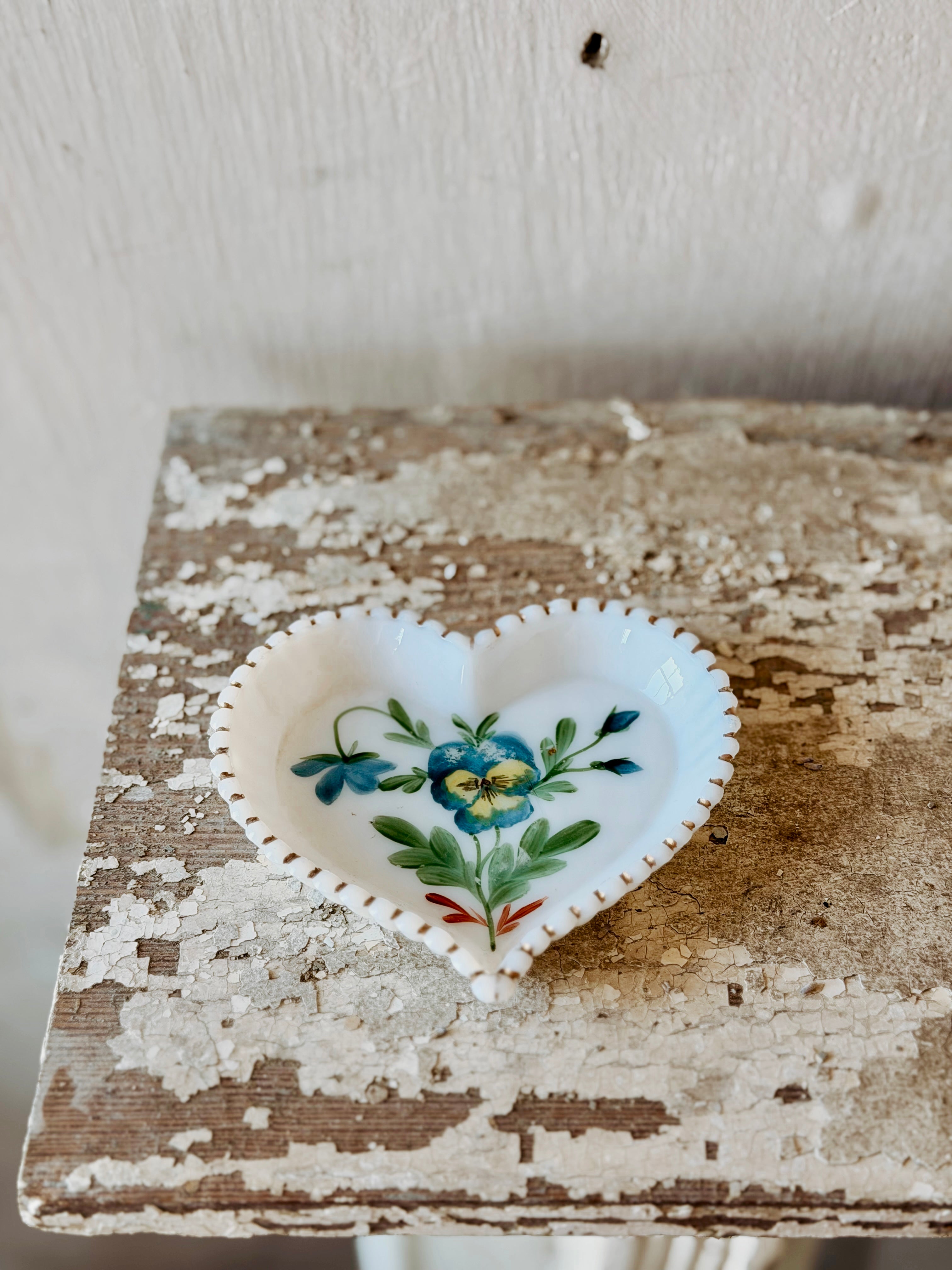 A hand painted violet adorns this heart shaped milk glass trinket dish.