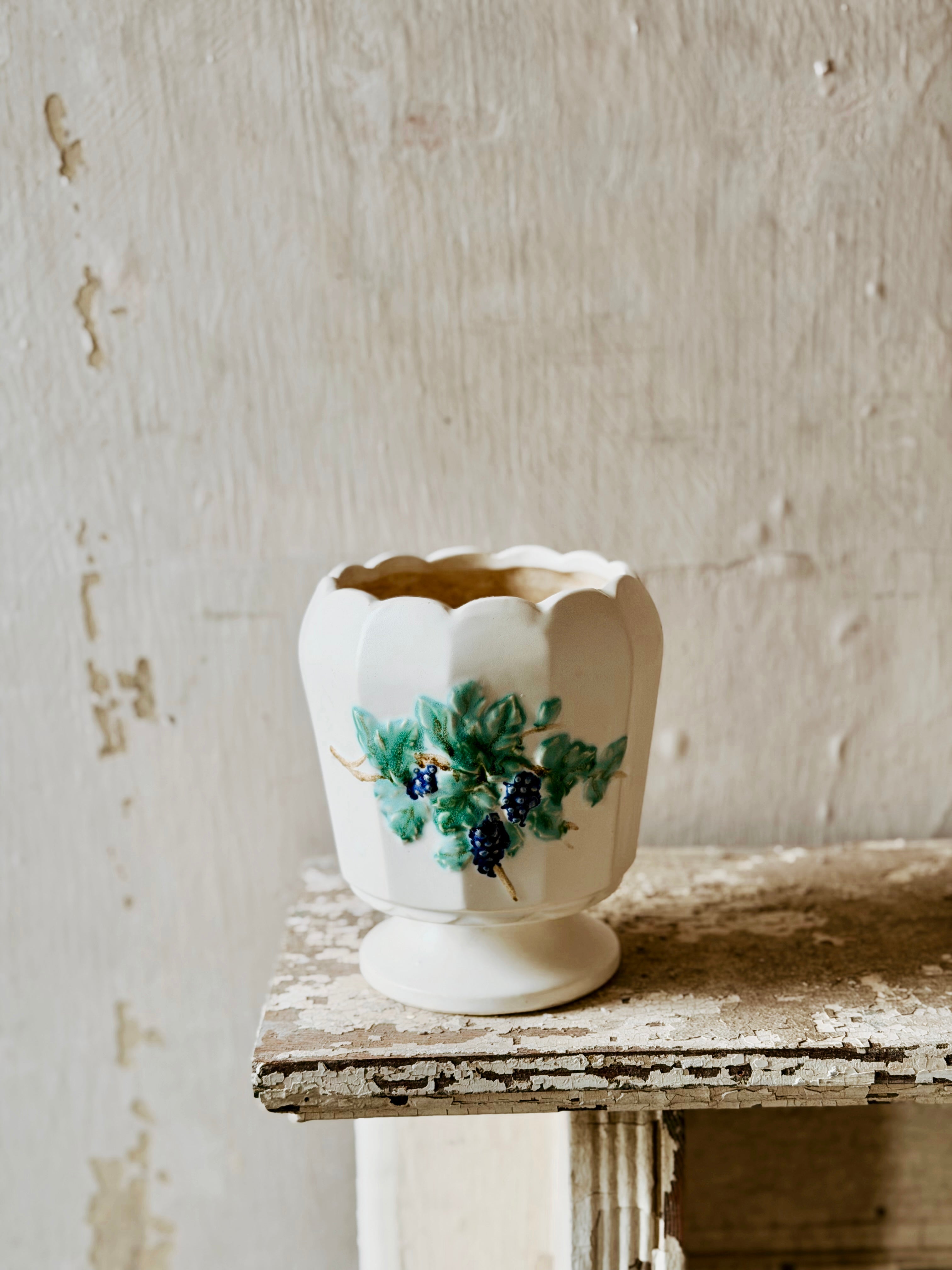 A white footed pedestal urn featuring a three dimensional grape cluster and leaves design. A beautiful addition to your home.