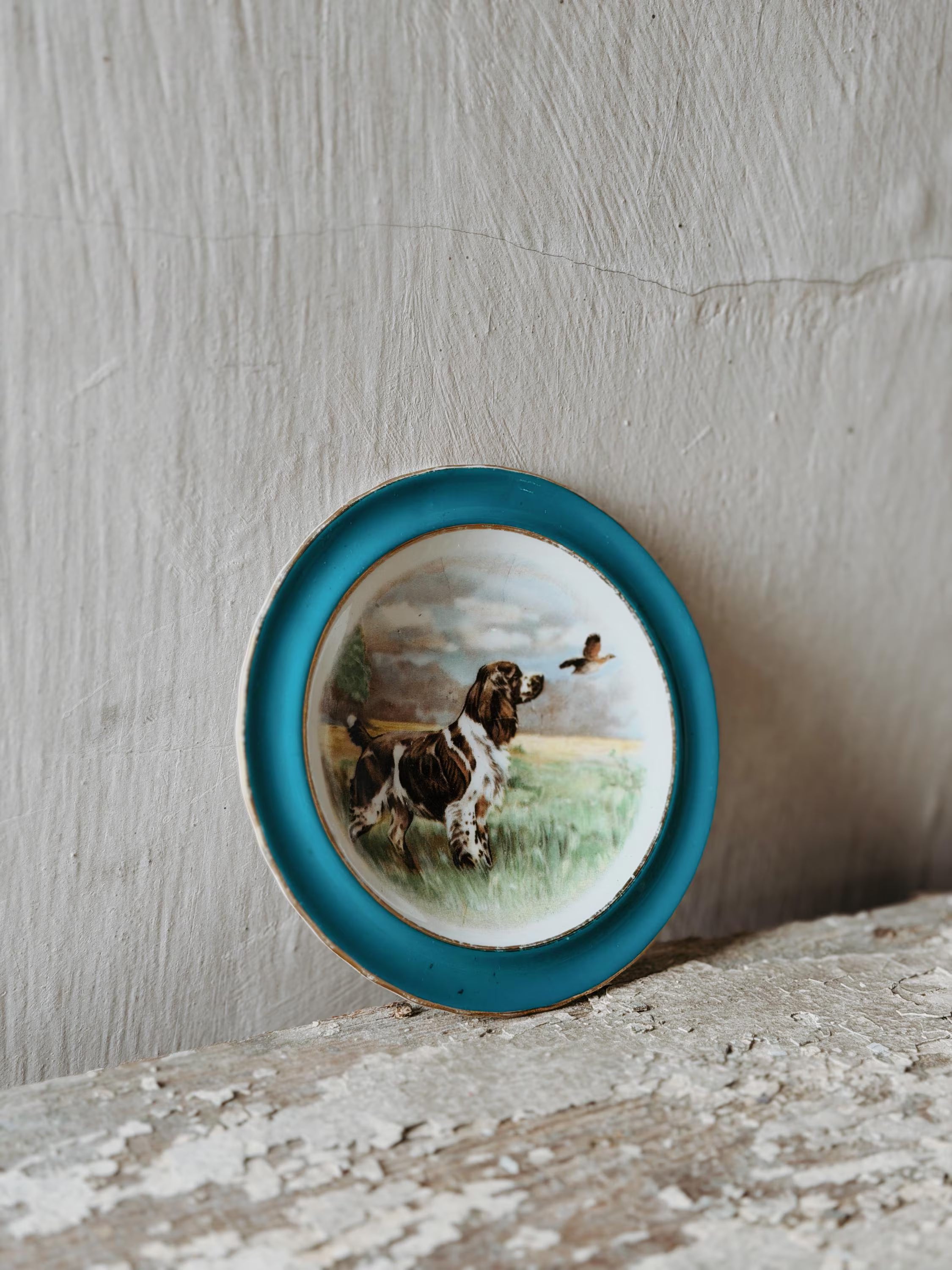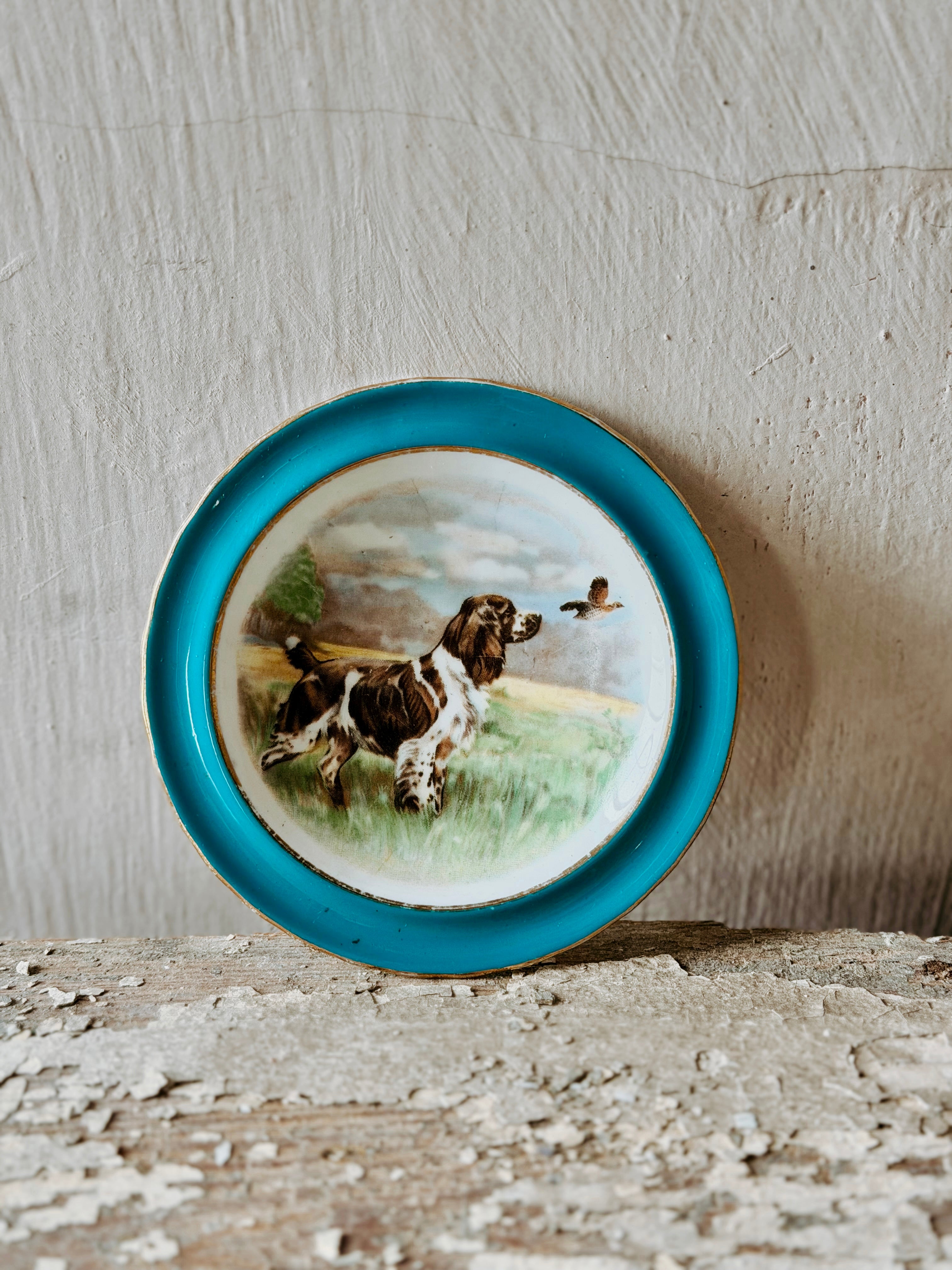 A vintage teal plate featuring an English hunting Spaniel in the center. A beautiful addition to your wildlife collection.